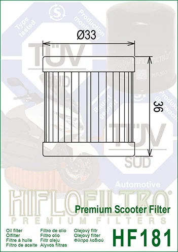 Filter HF181 je kompatibilný s viacerými značkami a modelmi skúterov a motoriek, vrátane populárnych vzorov od značiek ako Aprilia, Cagiva, Italjet či Piaggio. Medzi priradené originálne čísla (OE) patria napríklad CAGIVA 800093541, ITALJET 210410229 alebo PIAGGIO 410229, ktoré zaručujú plnú zhodu a spoľahlivosť pri výmene dielu. Kompletný zoznam OE čísel, ktoré je možné nahradiť filtrom HIFLOFILTRO HF181.